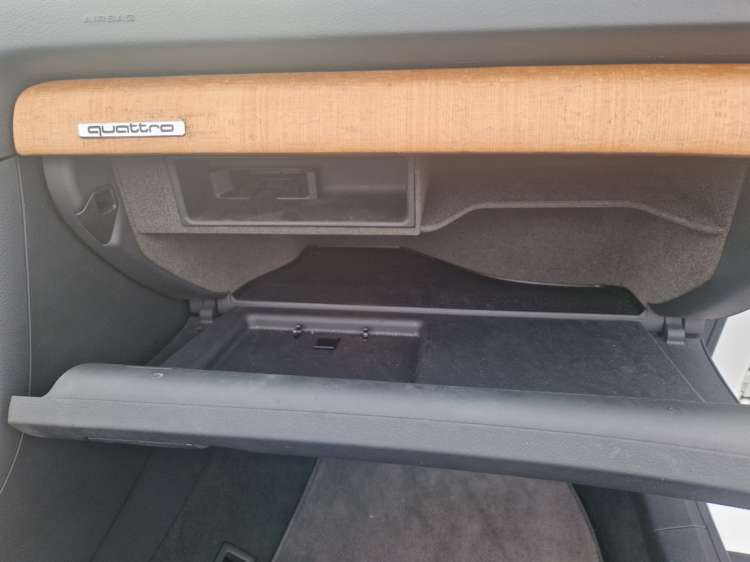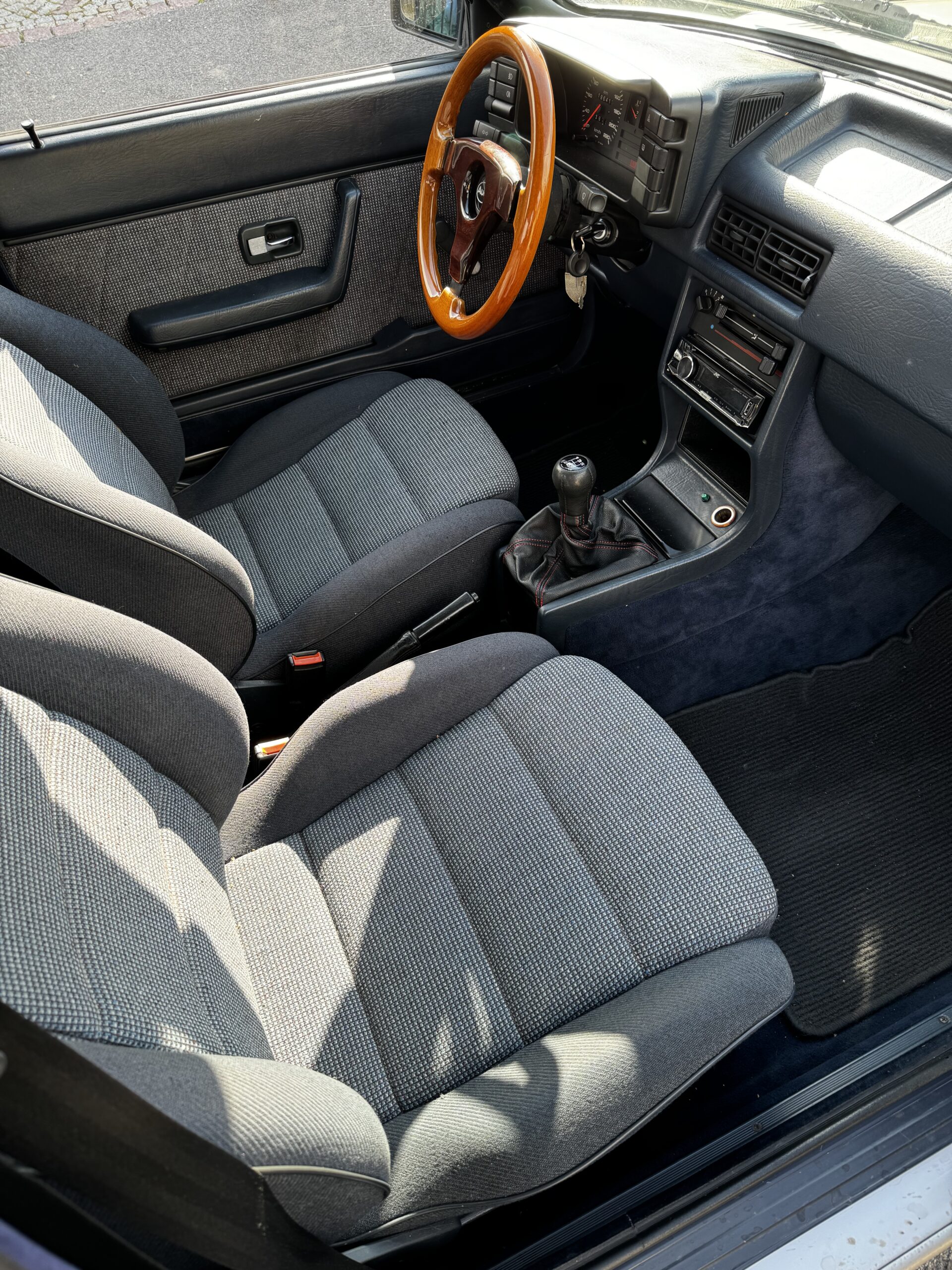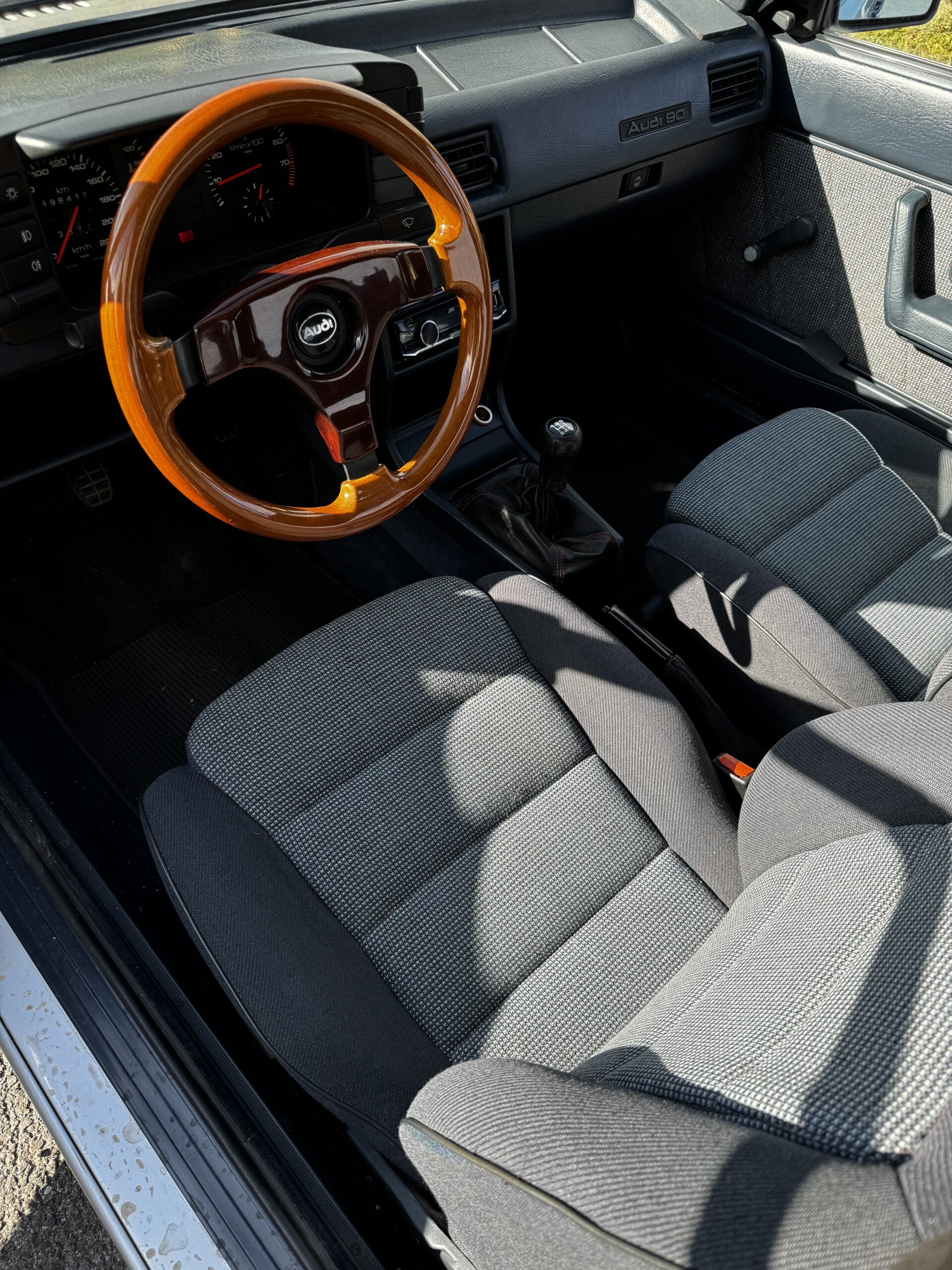 Wnętrze zachowane w bardzo dobrym stanie, widoczne jedynie minimalne ślady użytkowania. Tapicerka bardzo ładna, bez przetarć czy uszkodzeń. Żadne elementy nie były obszywane czy poddawane regeneracji. Oryginalne radio Audi Gamma z instrukcją i kartą kodową. Oryginalne dywaniki welurowe. Wszystkie zegary sprawne. Plastiki matowe bez rys czy pęknięć.