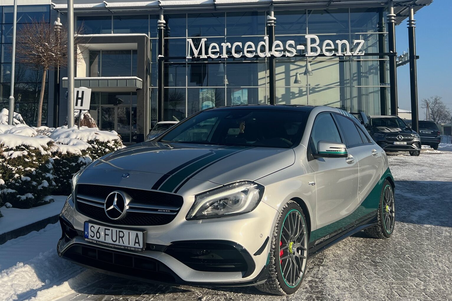 Mercedes A45 AMG PETRONAS. World Champion Edition! Jest to 1 z 250 sztuk wyprodukowanych na cześć zdobycia mistrzostwa świata F1 przez Lewisa Hamiltona. Wersja Poliftowa z 2016 roku. (Od wersji przed liftowej odróżnia go silnik w całości „zakuty”, oraz co ważne poprawiona, pozbawiona wad 7-biegowa skrzynia biegów 7GTronic Speedshift.)